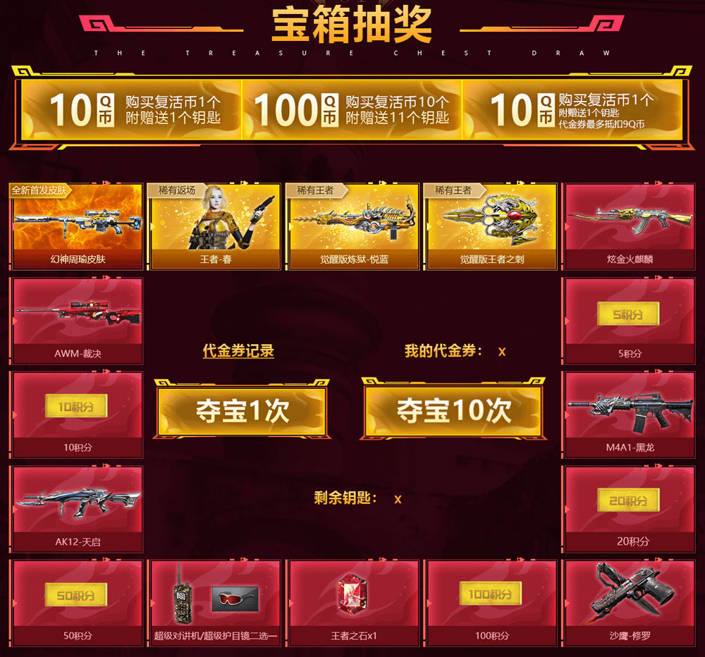 3 抽奖:抽奖获得的可分解道具存放在【暂存箱】中,可选择分解成钥匙或发往游戏仓库,已经领取到仓库的道具无法退换,请慎重(在参与活动期间请确认好绑定的大区);王者-春、超级对讲机、超级护目镜为唯一性道具,可重复抽到,但在游戏仓库无法重复获得;